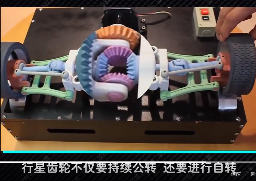 我們不坊通過1937年雪佛萊公司制作的一條視頻,了解一下工程師們的奇思妙想。首先在兩個車輪的軸上分別加上一根小天線,然后將一根棍子固定在其中一個軸上,它可以同時控制兩側車輪的轉動,但這在轉彎時還是行不通,下面嘗試讓這根棍子旋轉起來,如此一來即使按住一個輪子不讓他轉,另外一個也可以繼續轉動,只不過當兩個輪子速度相差太大時,中間的棍子就會掉線,于是工程師們又想到了一個辦法,將中間的棍子和兩根小天線都改成了雙輔,這樣兩個車輪就能自由的轉動起來了,后來為了避免輻條件的差距太大產生頓挫感,雙輻變成了多輻,多福輻成了齒輪,最終就有了我們現在看到的兩個半軸齒輪和中間的行星齒輪。顧名思義他在公轉的同時也能自轉,一般來說還會多加一個行星齒輪,以增加穩定性和改善受力情況。