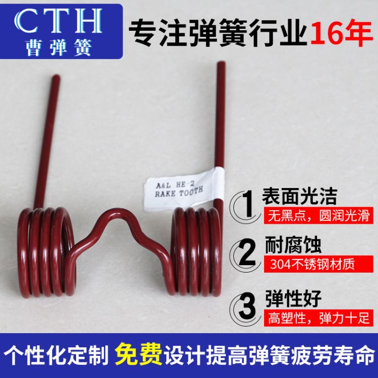 專注農機彈簧行業16年,我們所選用優質的上海寶鋼為304不銹鋼材。所制作的彈簧表面光潔無黑點,圓潤光滑手感好,在使用過程中具有耐腐蝕,所用材料為304不銹鋼材質。彈性好,塑性彈力十足,抗疲勞度好,得到客戶和農民大哥的一致好評。并免費為農機使用單位設計、制作高疲勞度壽命的農機彈簧,各種彈齒。顏色可以根據客戶的需要進行噴涂。